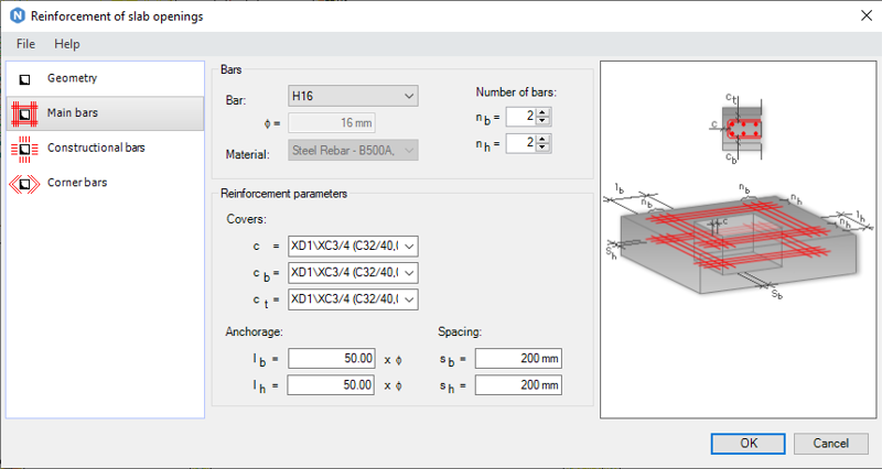 Generate reinforcement for various types of slab openings in your Revit model, including rectangular openings, round openings, and rectangular openings adjacent to one or two slab edges.