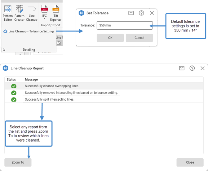 Clean up overlapping lines of the same style with a single click. Before running the tool, you can set a tolerance value. After the cleanup, a report dialog lists all changes made, with the option to zoom in on specific modifications for review.