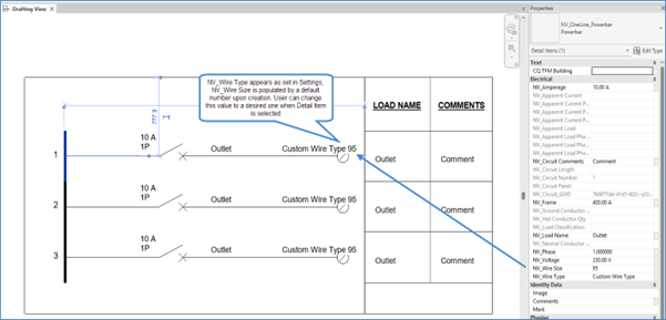 - 1f Note: NV_Wire Type and NV_Wire Size can be displayed on a Drafting View if a “NV_OneLinePlus_DetailTag: WireTypeSizeTag” is chosen in 23-25 One Line Schedule Settings. In 2026, NV_Cable Type and NV_Cable Size will be shown if “NV_OneLinePlus_DetailTag: CableTypeSizeTag” is chosen.