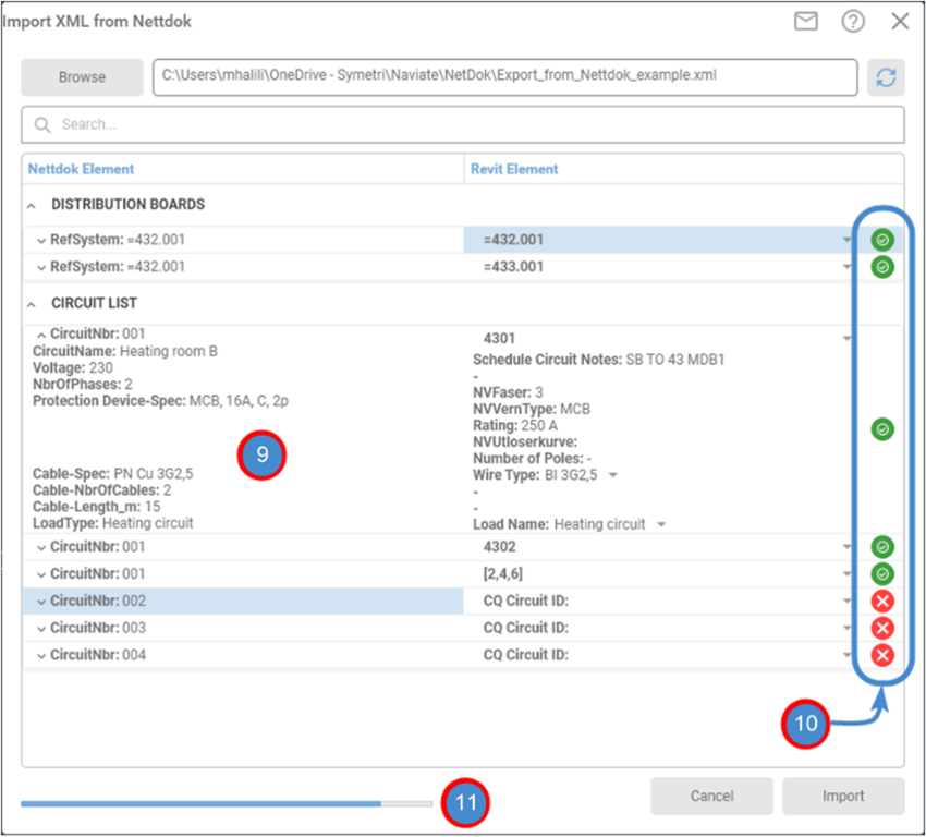 Figure 2: The Import XML from Nettdok dialog, showing Circuit parameters as well as status indicators.