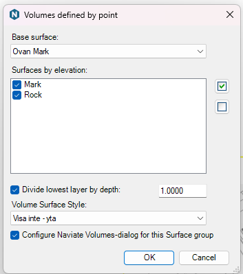 Define volumes report at Point is a new command to create volume surfaces between a Base Surface and all surfaces available at the selected point. The command can set up Naviates Report Surface volumes with the created volume surfaces and an optional division of the lowest layer to for instance split a rock volume into above/below 1m depth.