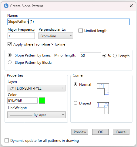 - When creating a Slope Pattern, a Frequency Line can be selected that is separated from the slope pattern lines. This enables for instance slope patterns on both sides of a road to use the same alignment as frequency line which means they will always be perpendicular to each other.