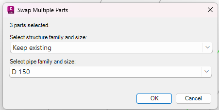 Swap Parts has been updated to be able to select first/last pipe network object when selecting. Pipes and Structures can be swapped at the same time, or one type can be kept intact.