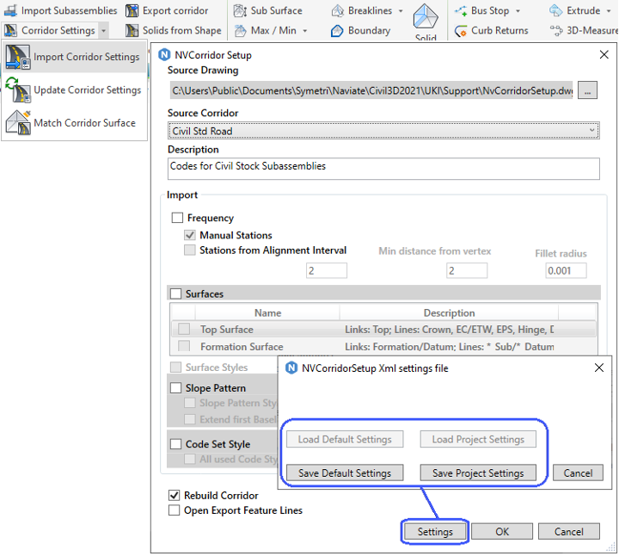 Added the possibility to save and load project or default settings to XML-file. Saved settings can be used in new command NVCorridorSetupUpdate to batch update corridor settings.