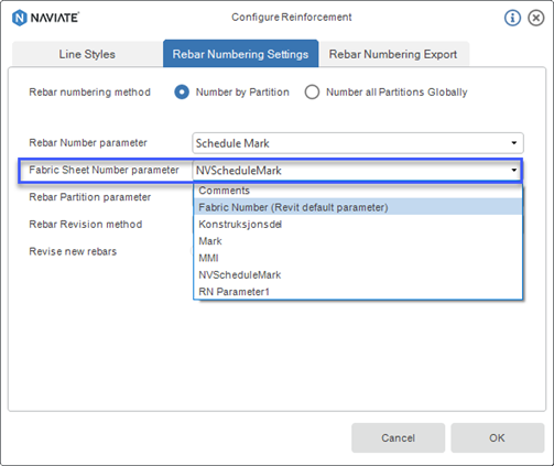 You are now able to choose which parameter will be used for numbering Fabric Sheets, in drop-down list you will have all parameters that support Fabric Sheets. Default parameter is Fabric Number, that is Revit build in parameter and it can't be used for custom numbering, to apply custom numbering select any other parameter from the list (e.g., NVScheduleMark).