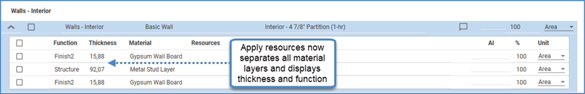 Apply Resources has been updated to display all material layers of System Families individually. Previously, layers composed of the same material were grouped together. With this enhancement, users can now also view the function and thickness of each layer when applying resources. This change does not affect Loadable Families.